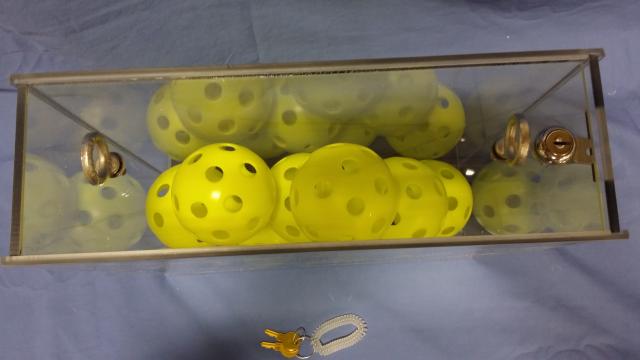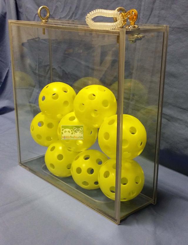 At approximately 14" x 4-1/2" x 14" high, it's the perfect size for a challenging yet achievable task. The optically clear case with colored internal balls adds to the intrigue, and the eight hard plastic balls with holes are easy to remove and sterilize for multiple rounds of play. With two completely enclosed eye bolts for hanging, you can put this anywhere and watch the magic happen.