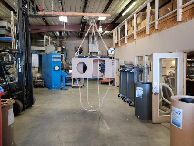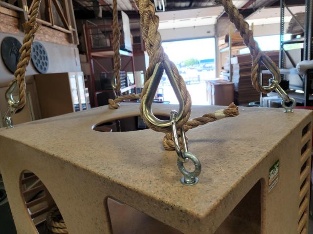 - Traditionally, the unit is suspended from (4) high-strength machine-grade Eye Bolts; (1) in each corner. From each Eye Bolt, a Carabiner attaches to a rope utilizing a metal Thimble which further strengthens the interwoven Eye located on the 48” of 1” diameter Pro-Manila Rope. At the other end of this rope, a similar Thimble / Eyelet is used. This end, as well as the other (3) Hanging Rope ends are attached to a single Lifting Shackle to allow a single-point attachment at your facility.