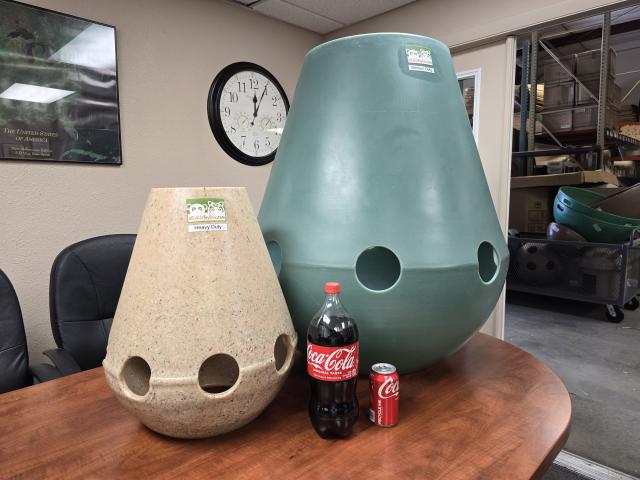 The SMALL ONE sits at 17” in diameter at its beltline and stands about 21 inches tall, so your smaller friends can easily crawl in and out. It has large exit holes on both ends as well as lots of viewing holes around the perimeter.